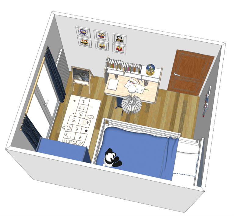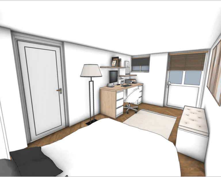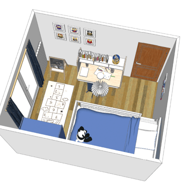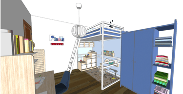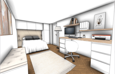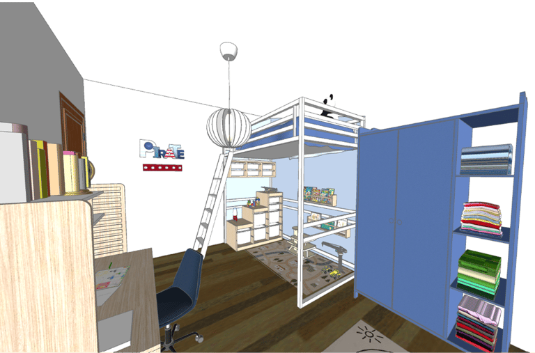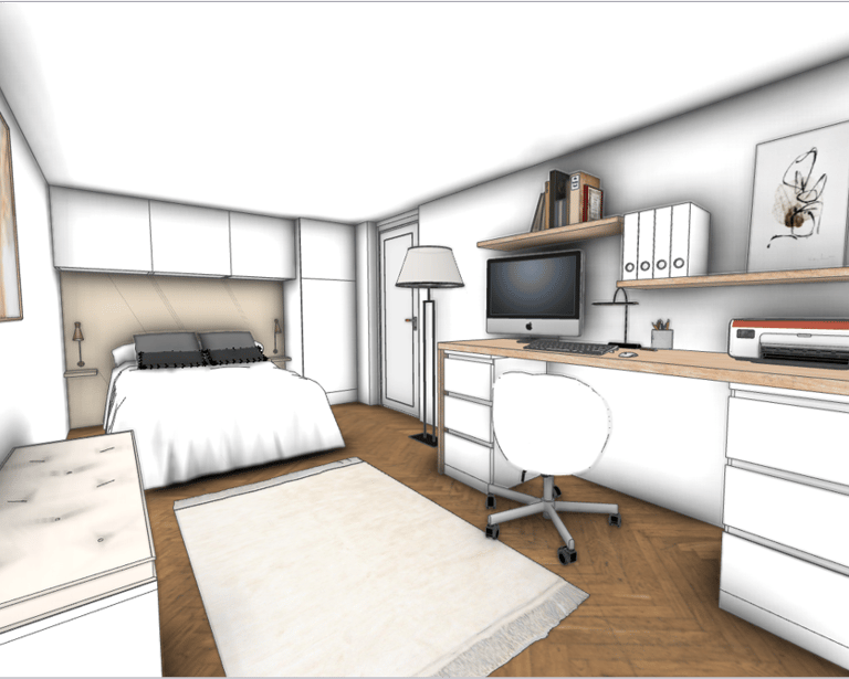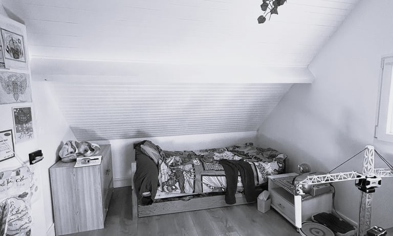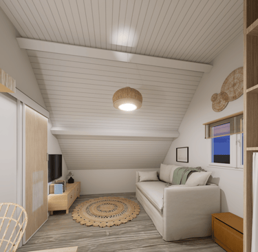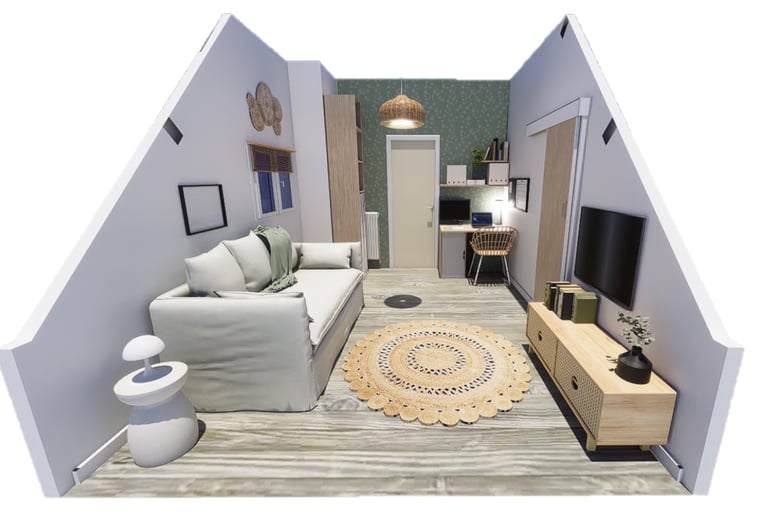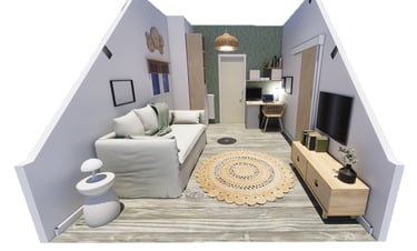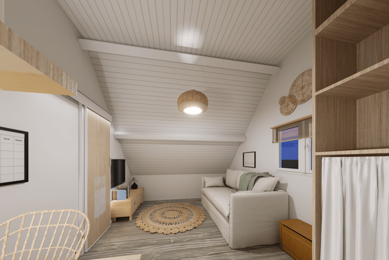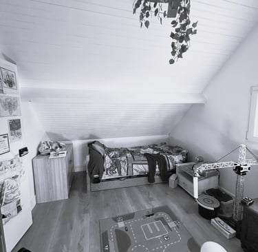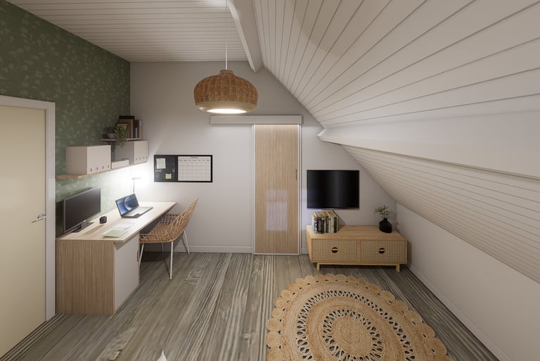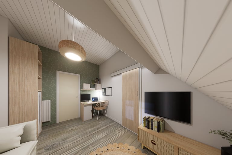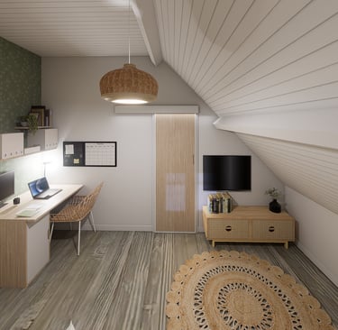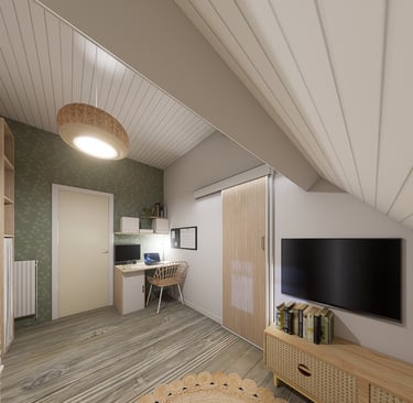 Transformation d'une chambre d'enfant sous comble en un espace multifonction (chambre d'invités, bureau télétravail et espace détente)