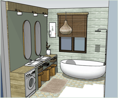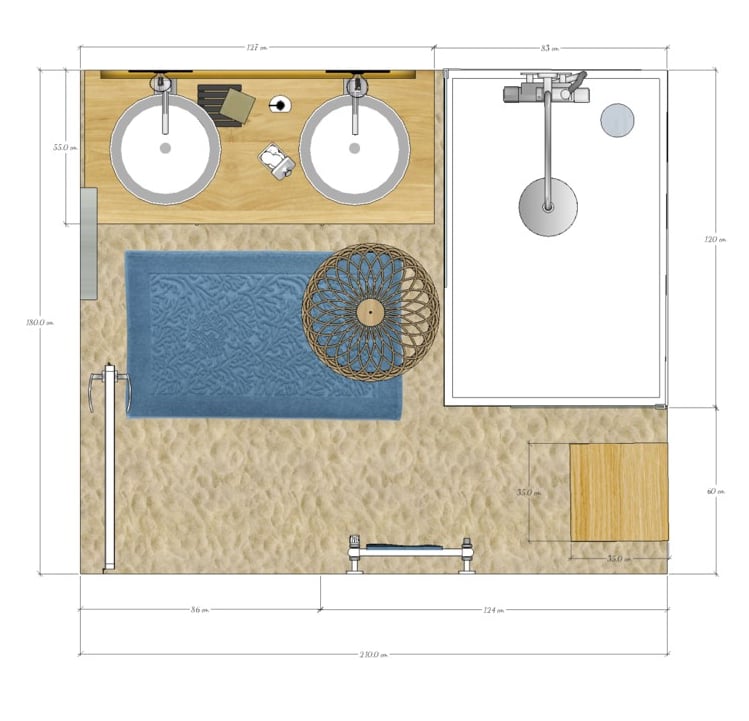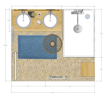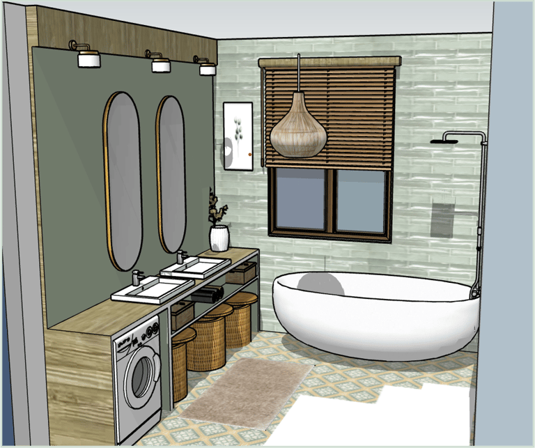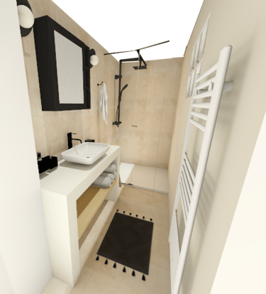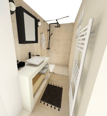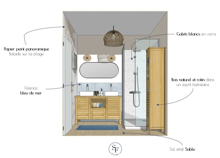 Rénovation d'une salle de bain en salle d'eau avec pour demande : double vasque, douche à l'Italienne, colonne de rangement, décoration esprit balnéaire